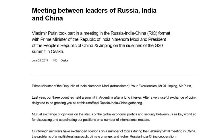 Nevertheless, the first effort to upgrade the RIC strategic triangle was made at the Buenos Aires G20 summit of December 2018. However, India sought to balance this first leader-level trilateral of Putin, Modi, and Xi by initiating a parallel Japan–America–India (JAI) trilateral summit.