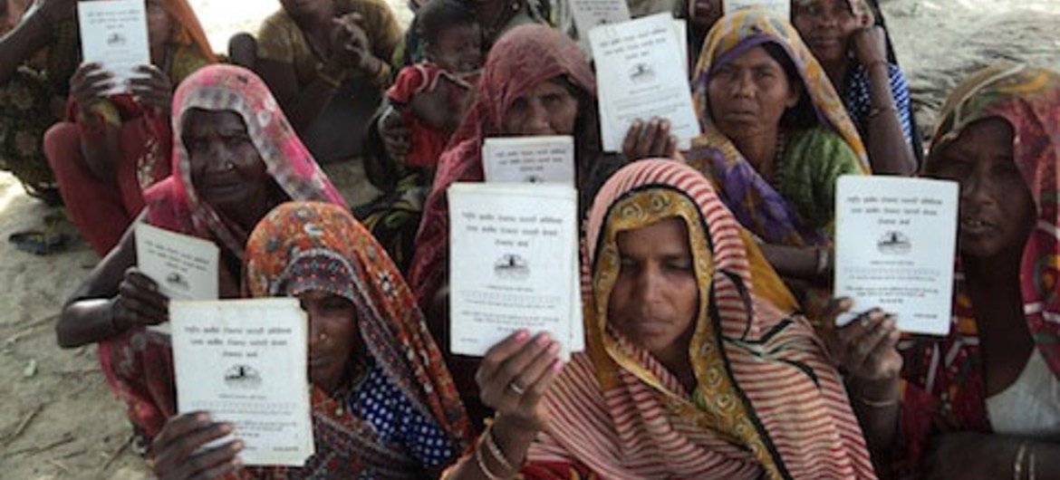 Image: Dalit women with job card in Chakrapanpur Village, Varanasi, Uttar Pradesh. Photo credit: Leena Patel/UN Women