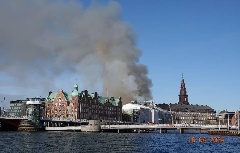 Photo: On April 16, 2024, the old stock exchange, Børsen, caught fire. Børsen is located right next to the Danish parliament seen to its right. The building was under renovation to celebrate its 400-year jubilee. The plan is to reconstruct the building by 2025. Photo taken by Stig Toft Madsen.