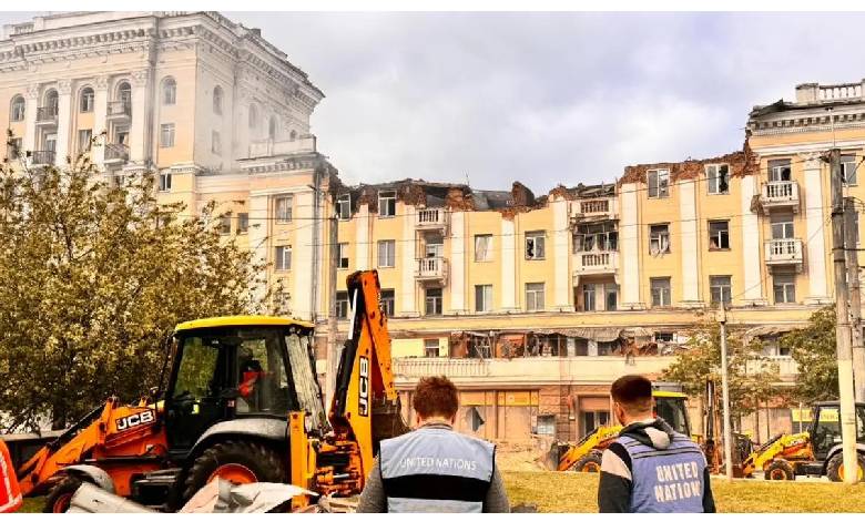 Photo: A bombed building in Ukraine. Photo by Nelia Zabalostska-Siennikov, OCHA.