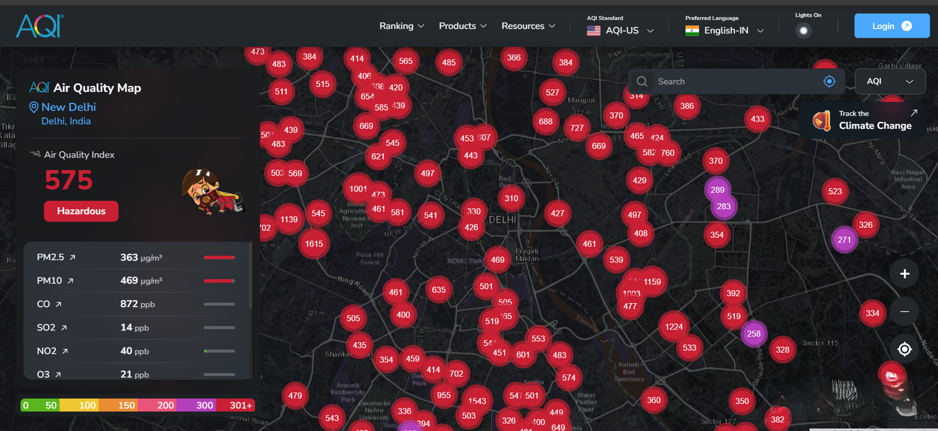 Image: Delhi shown as averaging at 575 in the AQI.in website at 1 AM on 21st October 2025