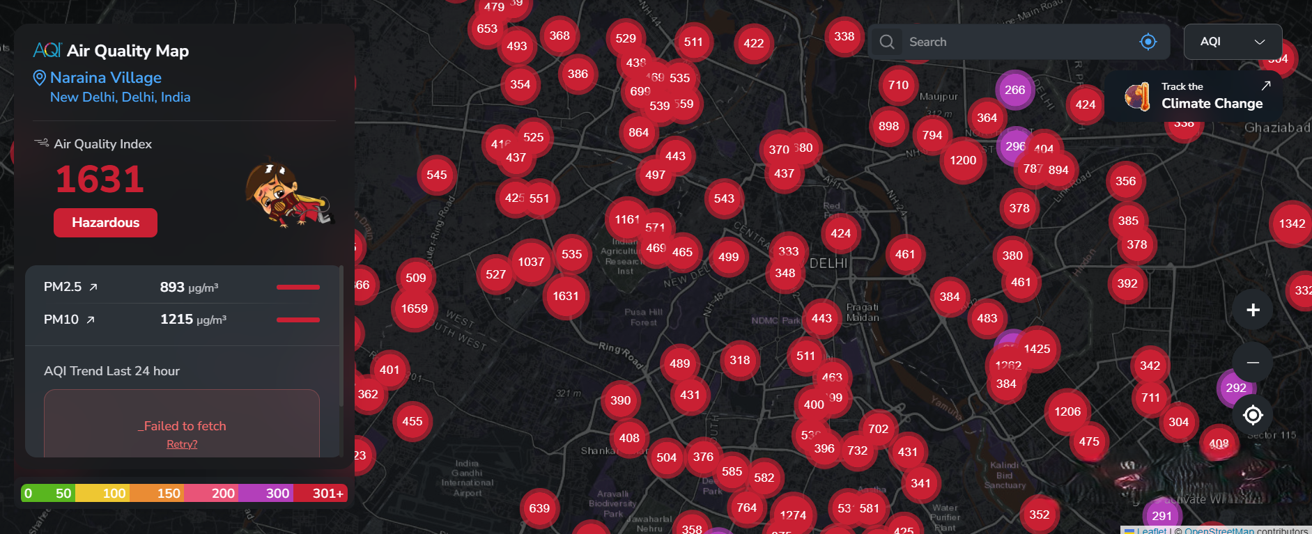 Image: A reading of 1631 AQI at Nariana village in South-west Delhi on the AQI.in website at 1 AM on 21st October 2025