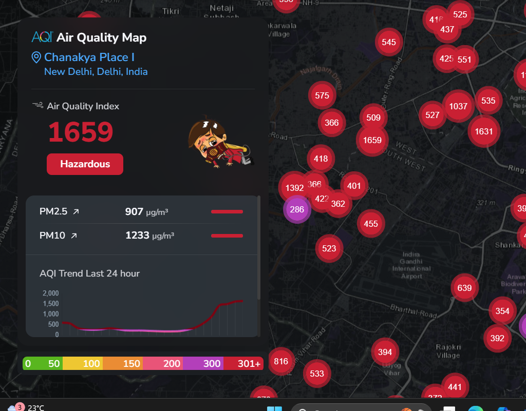 During the intervening night, The Polity’s Google search led it to live AQI data from other entities like AQI.in. What came out past midnight was a shocking sight of AQI spiking to record levels across Delhi and NCR, with more than readings at more than 1000 at a high number of places and beyond 1500 in a few. As the images recorded past 1 AM of 21st October shows, Chanakya Place in Central Delhi recorded a high of 1659, followed by 1629 in Nariana area of South West Delhi, Sector 13 Dwarka at 1505, and 1445 in Sector 26 Noida.