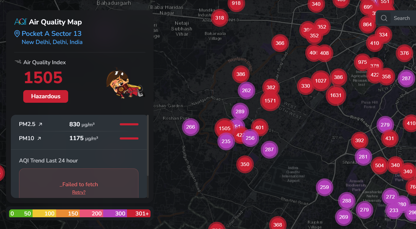 Image: A reading of 1505 recorded in Sector 13 Dwarka in South-west Delhi on the AQI.in website at 1 AM on 21st October 2025