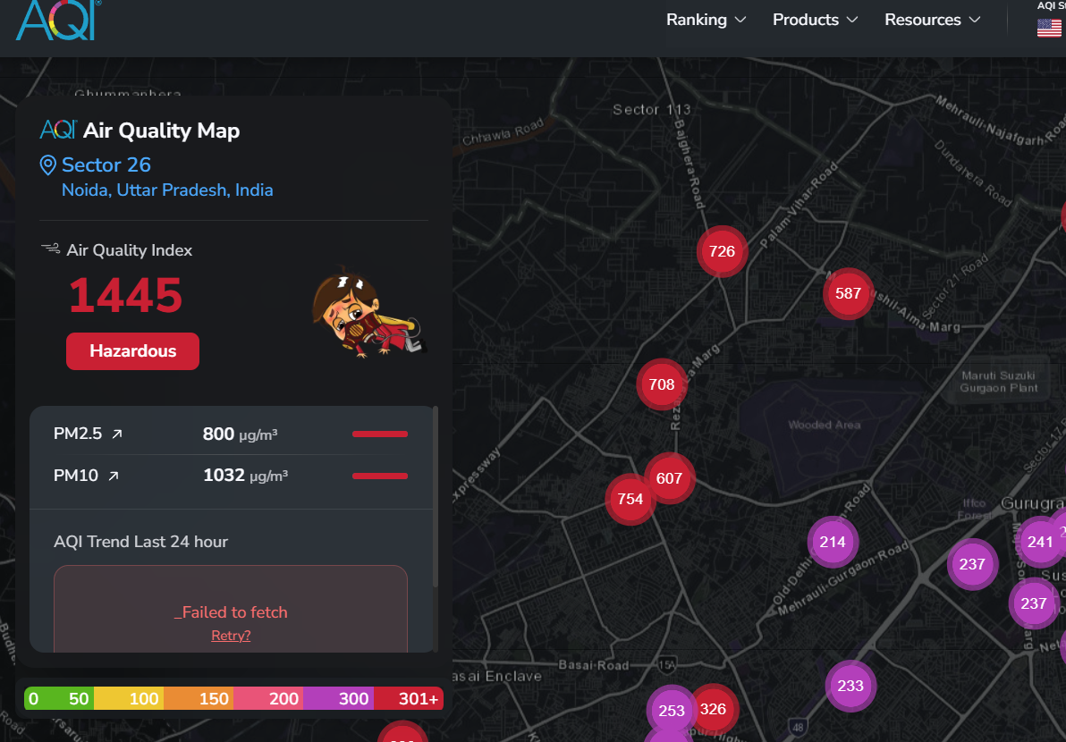 Image: A reading of 1445 in Sector 26, Noida in the NCR area of Uttar Pradesh on the AQI.in website at 1 AM on 21st October 2025