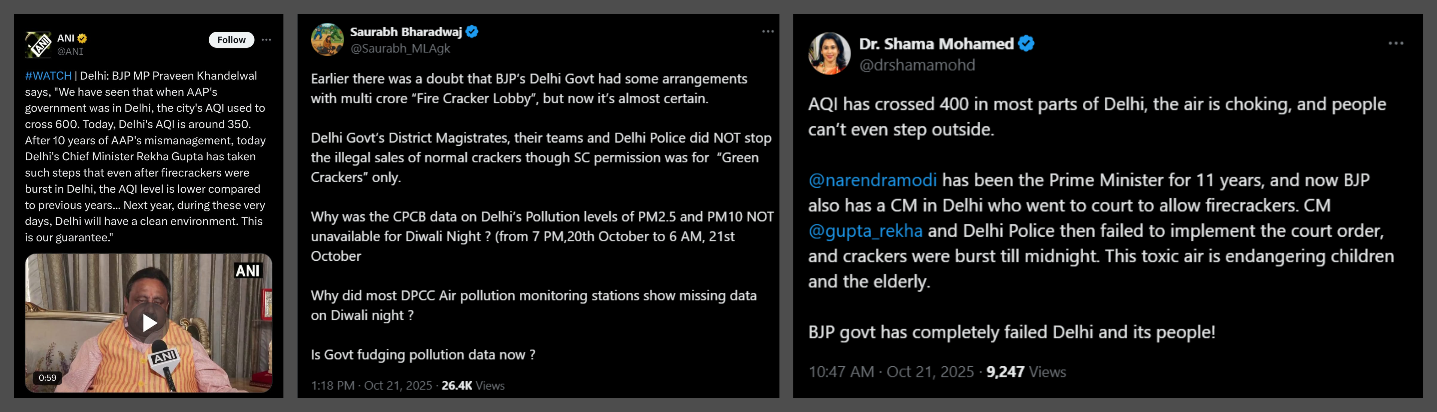 Bharadwaj also alleged a nexus between the ruling BJP and the “firecracker lobby,” and questioning whether the government is “fudging pollution data.”