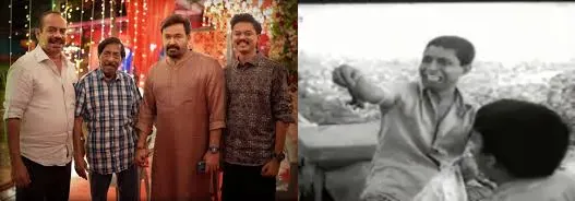 Image: One of the last pictures taken of Sreenivasan (left), with Sathyan Anthikad and Mohanlal on the set of Hridayapoorvam, and a still from his first movie, Manimuzhakam (right)