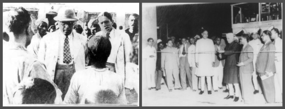 Image: Ambedkar talking to people as the Labour Member in the Viceroy's Executive Council at the coal mines in Dhanbad (left); photo source - Dr B R Ambedkar's Caravan, and Prime Minister Jawaharlal Nehru inaugurating the Damodar Valley Corporation (right)
