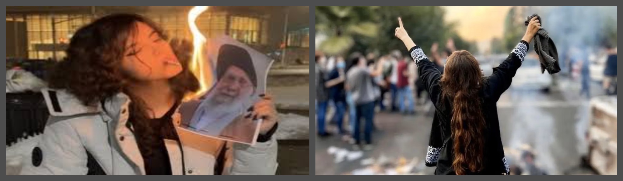 Image: In what could be iconic images from the Islamic Republic, a woman protestor lighting a cigarette from a burning picture of Ayatollah Khemeni (left), and a woman protestor without a hijab (right)