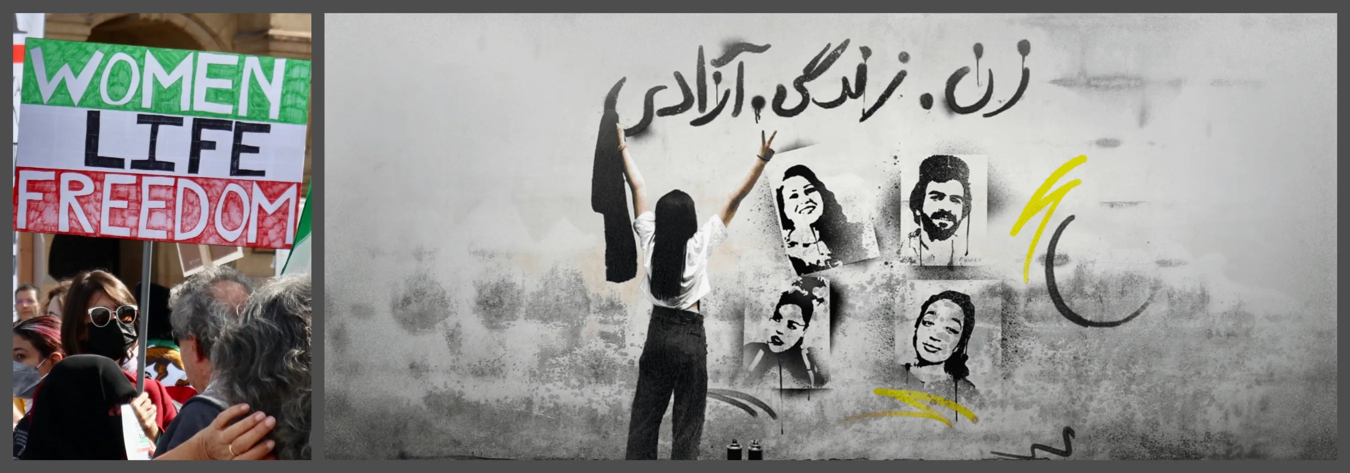 Image: Protestors and posters representing the Women, Life, Freedom protest of September 2022, following the death of Jina Mahsa Amini, who was arrested by the moral police, allegedly for not wearing the hijab properly