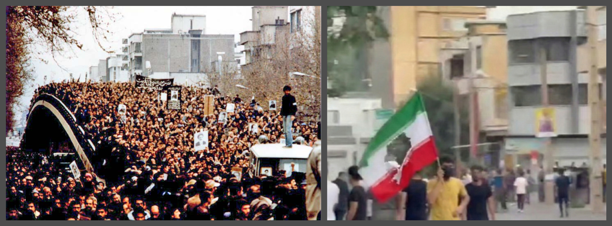 Image: Then and now - Protestors march during the Islamic revolution in 1978 (left), and protestors now waving a flag with the emblem of the Islamic regime being torn out (right); photo source - Wikimedia Creative Commons