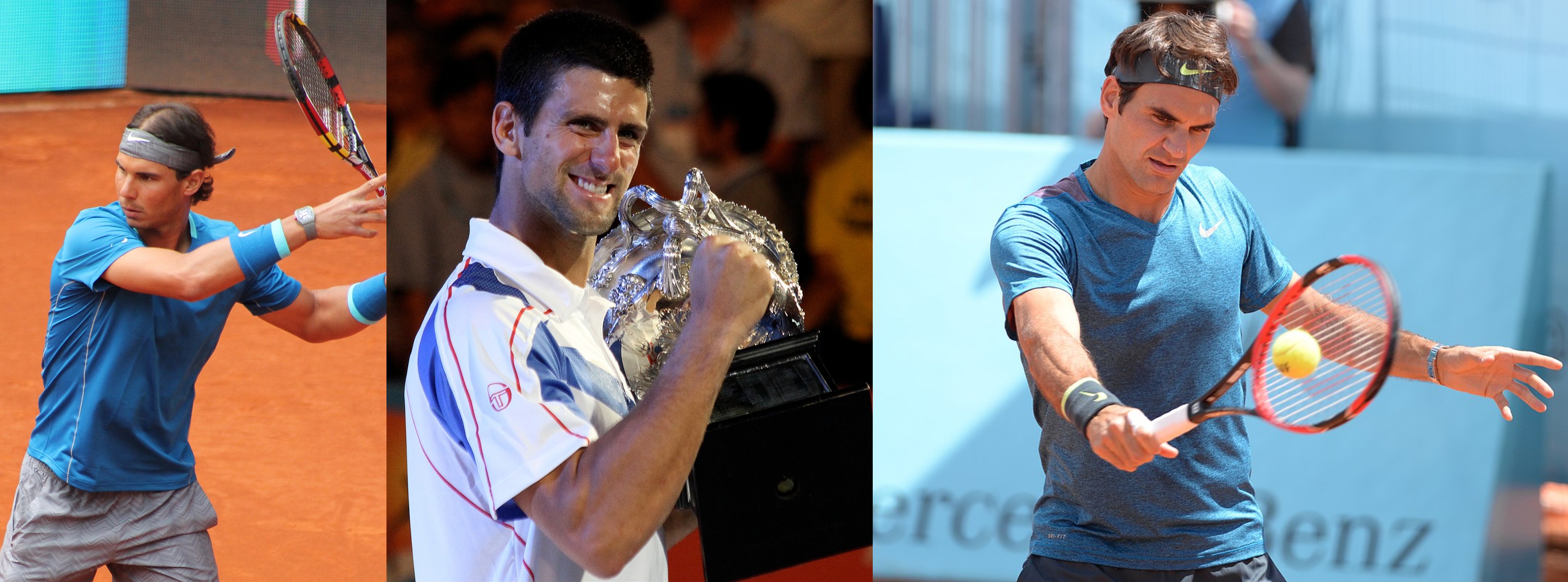 The Big Three - Rafael Nadal (left), Novak Djokovic (centre), and Roger Federer (right); photo source - Wikimedia Commons