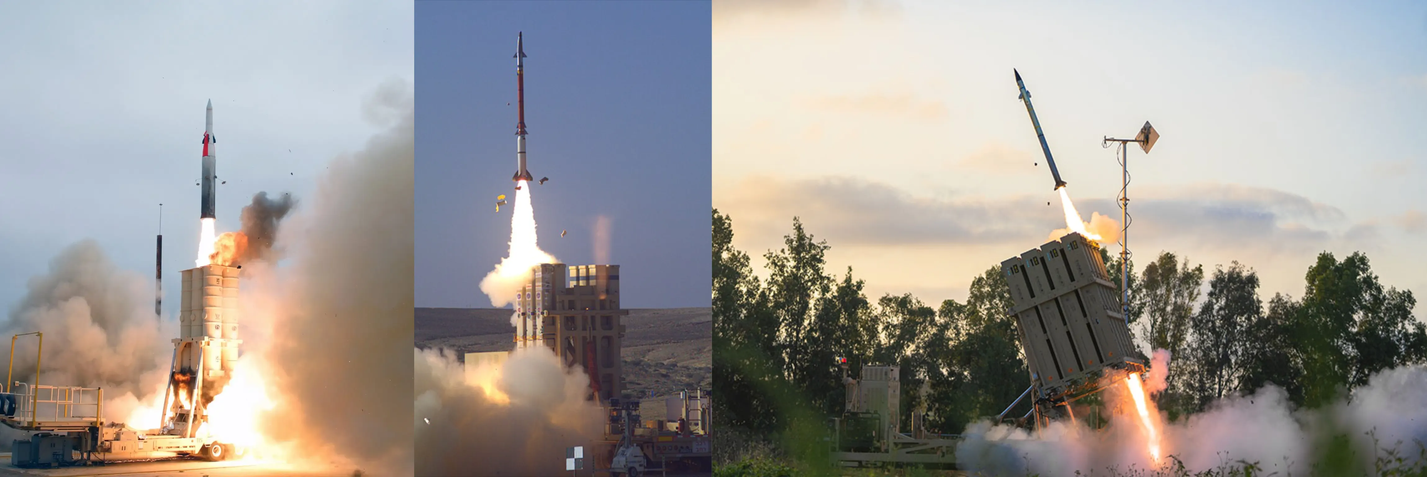 Israel's layered BMD system: Arrow-2 (left), David's Sling (centre), and Iron Dome (right)