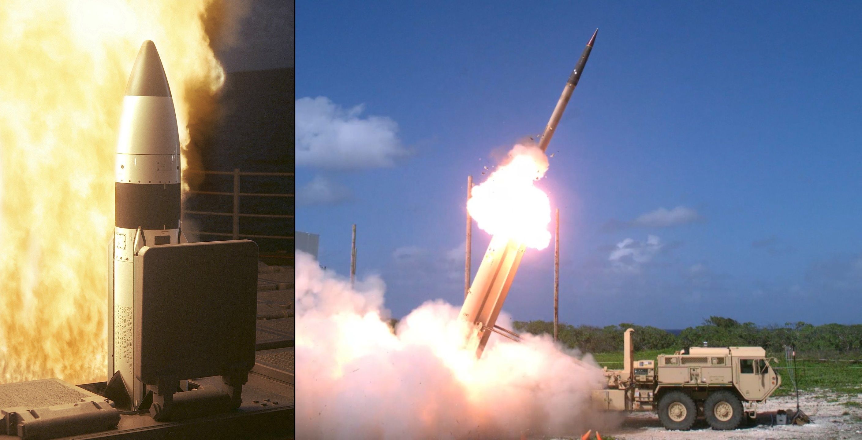 The US theatre systems: A Standard Missile-3 fires from a US destroyer (left), and a THAAD system fires from a road-mobile launcher