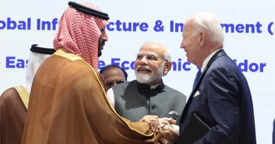 Saudi prince Mohammed Bin Salman (left), PM Narendra Modi (centre) and US President Joe Biden (right) at an IMEC meeting