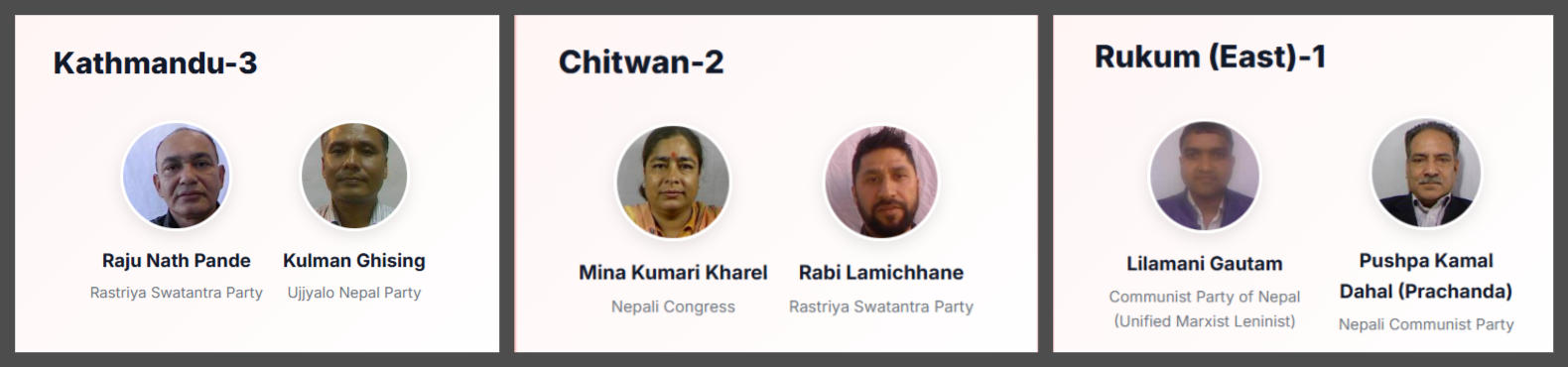 In Chitwan-3, Renu Dahal (NCP) resigned as Bharatpur mayor to campaign on her developmental achievements against incumbent Sobita Gautam (RSP). The absence of major pre-election alliances in the district has resulted in confrontations between the organisational strength of the NC and UML and the personal appeal of RSP candidates.