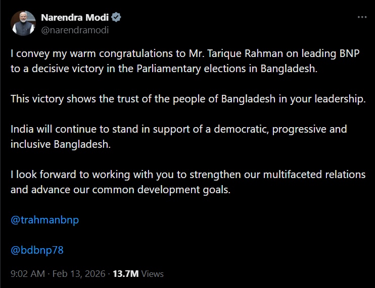 At the same time, West Bengal Chief Minister Mamata Banerjee sent flowers and sweets to “Tarique Bhai,” underscoring deep cultural and regional ties. This outreach has been backed by high-level engagement, including External Affairs Minister S. Jaishankar’s presence at Khaleda Zia’s funeral, followed by a condolence motion in the Indian Parliament.