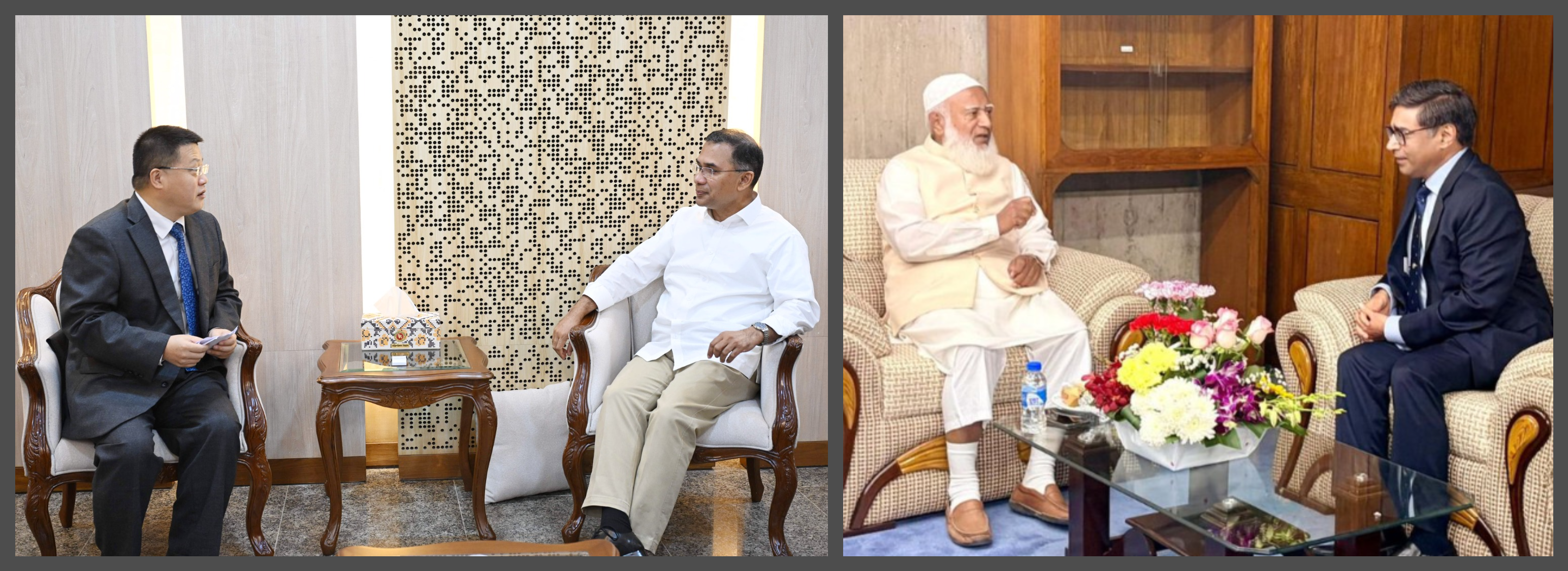 The Chinese ambassador meets the PM Tarique Rahman (left), and India's Foreign Secretary Vikram Misri meets the Jamaat-e-Islami chief Shafiqur Rahman (right); photo source - BNP and PTI