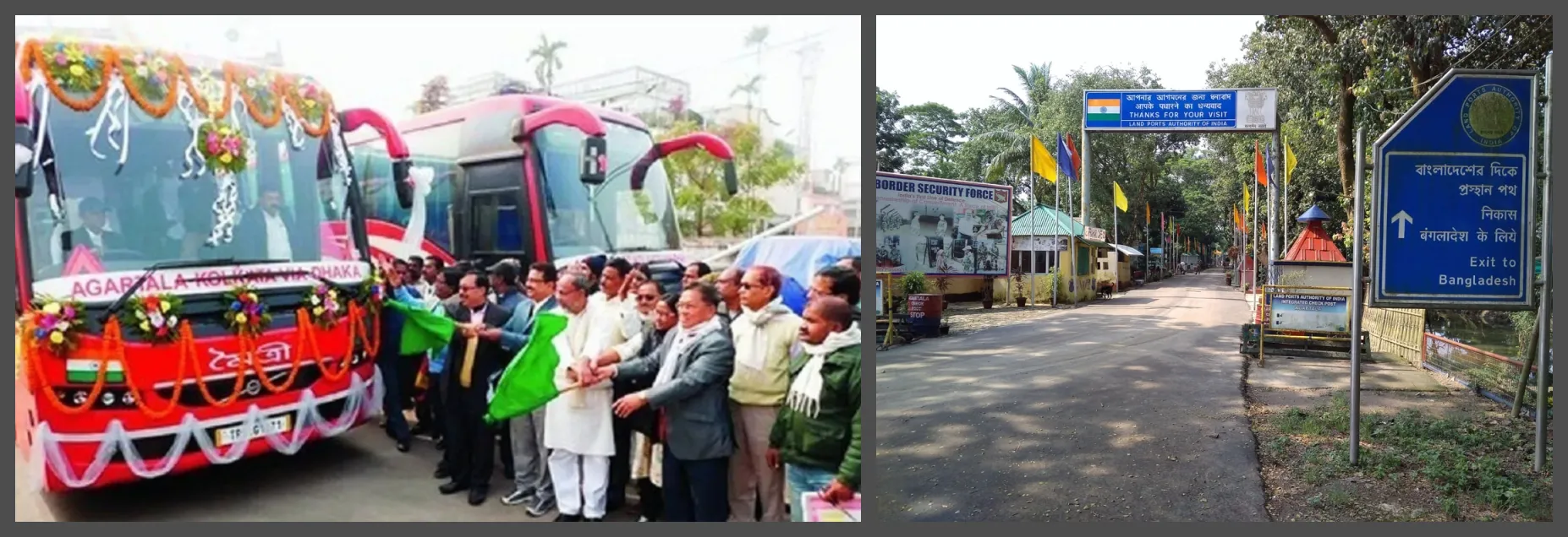 The Agartala-Dhaka-Kolkata bus flagged off (left) at the Akhaura border (right)