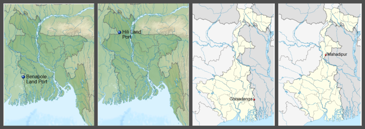 On the map: the border check points and land ports along the West Bengal-Bangladesh border; source - Wikimedia Commons