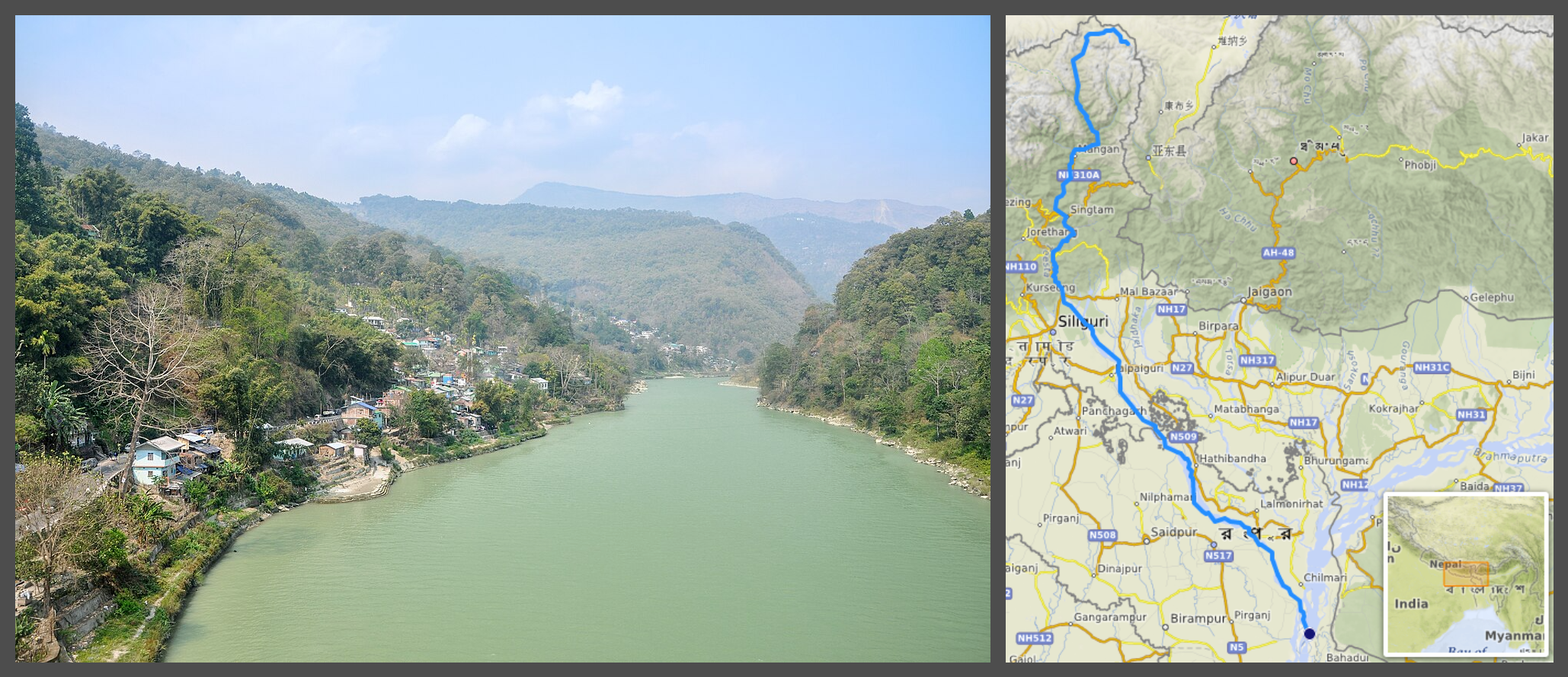 A picture of the Teesta River (left), and the map depicting the river's flow; photo credit - Joydeep and OpenStreeMap
