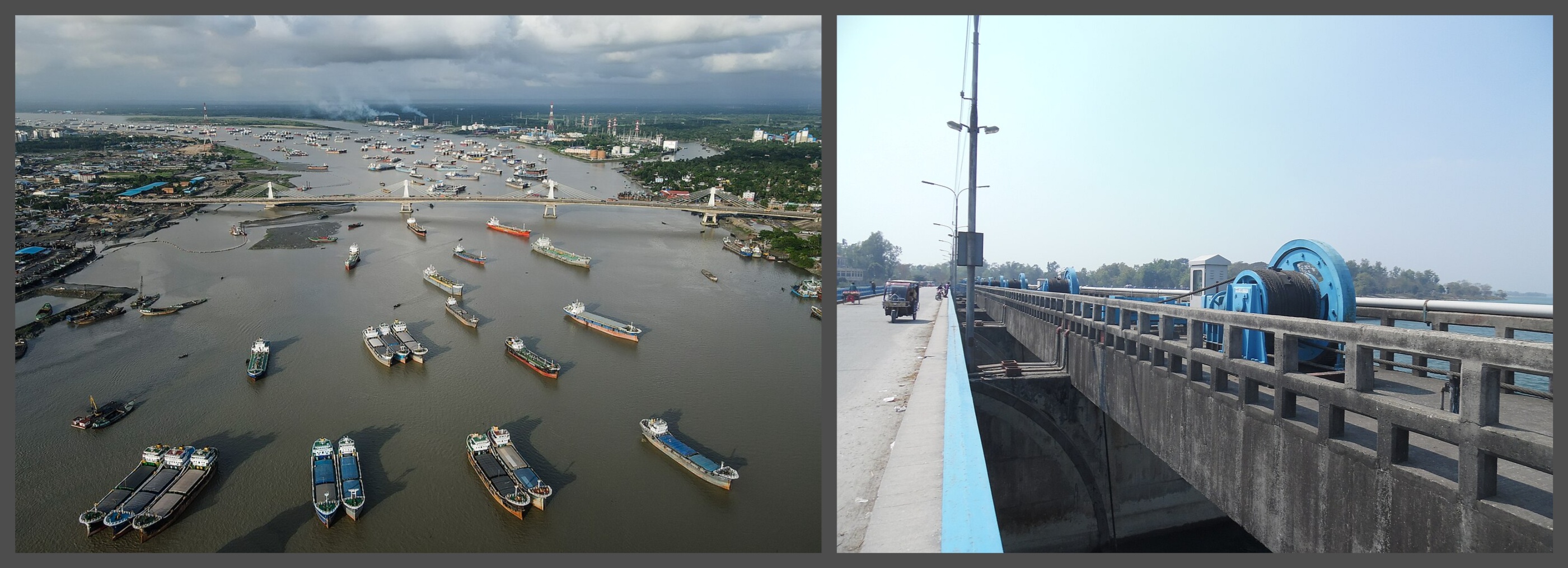 An aerial view of the Shah Amanat Bridge over the Karnaphuli river, which flows via Mizoram before entering the Chittagong hill tracts in Bangladesh (left), and a barrage over the Teesta (right); photo source Muhammad Amdad Hossain and Wikimedia Commons