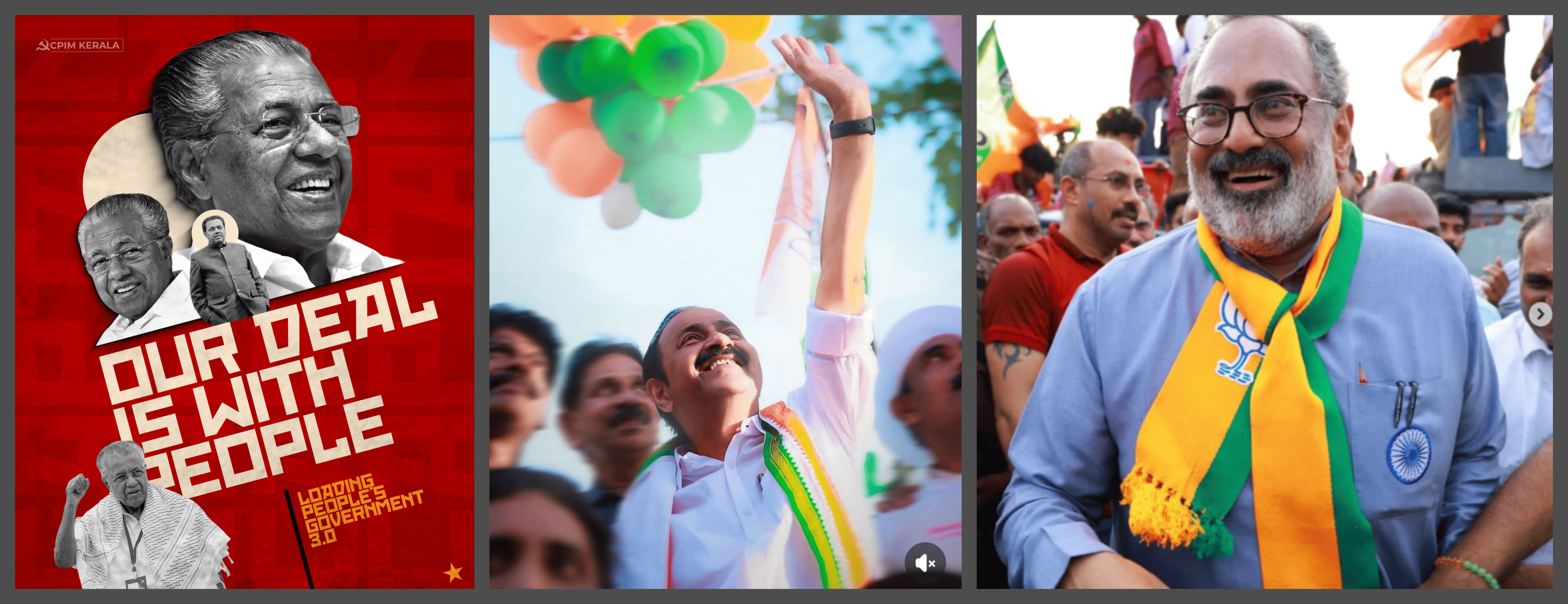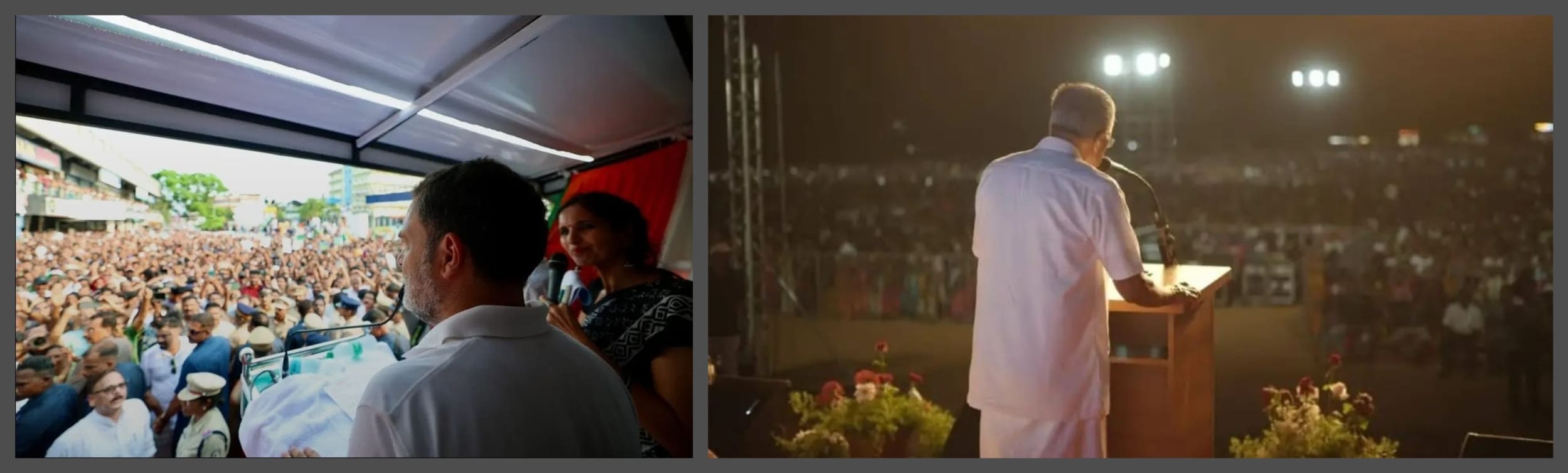 Leader of Opposition in Lok Sabha, Rahul Gandhi, addressing a rally (left), and CM Pinarayi Vijayan addressing a late evening election meeting (right)