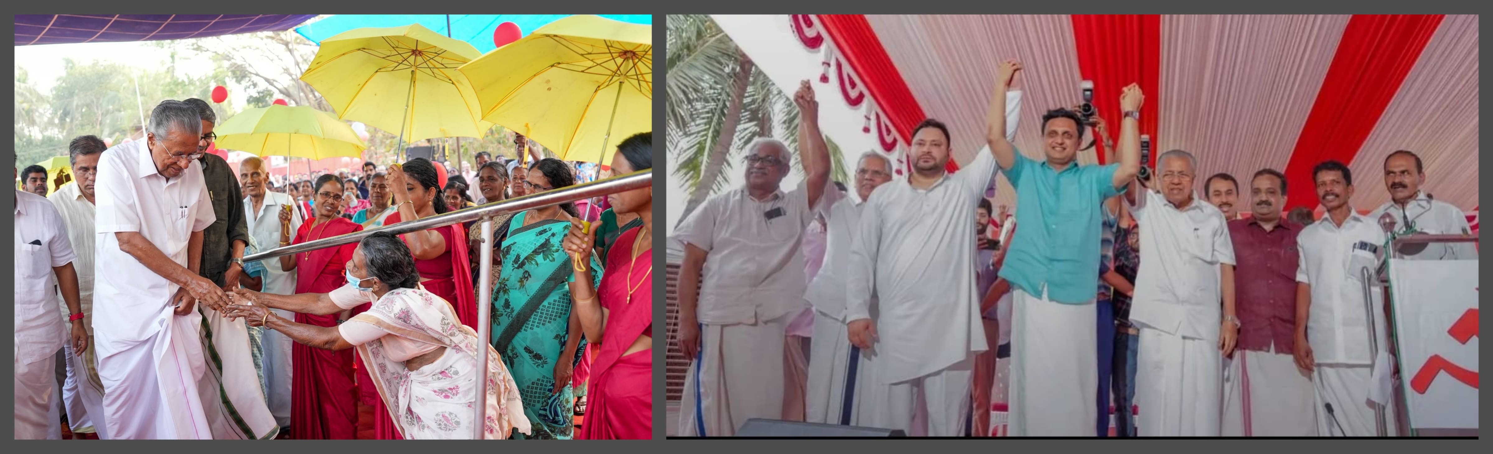 CM Pinarayi Vijayan greeted by women supporters (left), and the CM with his son-in-law and PWD minister P.A. Mohamed Riyaz and RJD leader Tejaswi Yadav, whose party is a LDF constituent (right)
