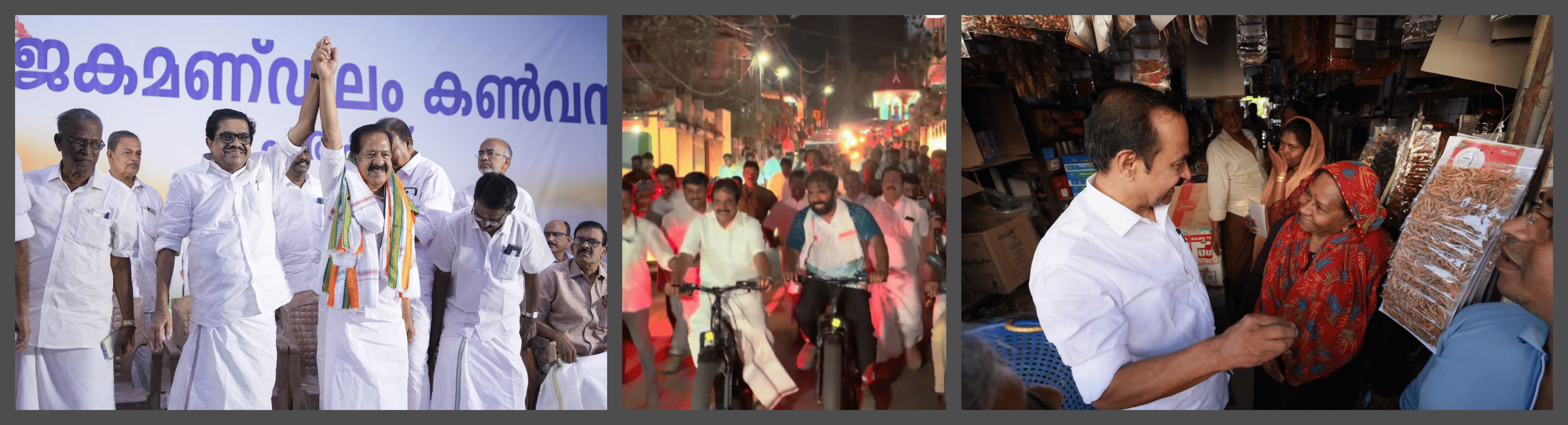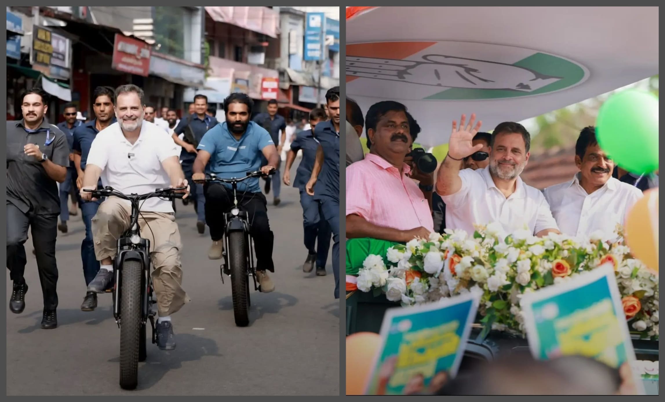 Rahul Gandhi bikes with Chandy Oommen, sitting MLA from Puthupally and former Chief Minister Oommen Chandy's son (left) in a iconic picture by now as the latter shunned posters in favour of this direct mode of campaigning; Rahul Gandhi with AICC Organisation Secretary K.C. Venugopal and Praveen Kumar, Kozhikode DCC chief and candidate for Koyilandi (right)