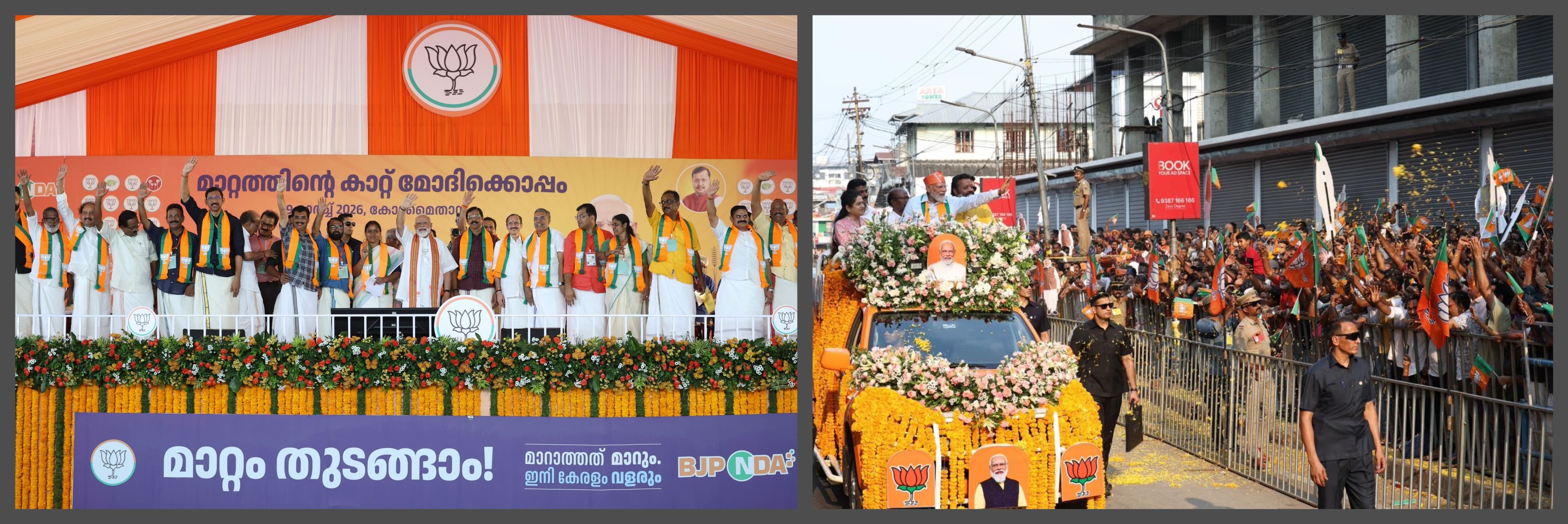 PM Modi at a election rally in Kozhikode (left) and during a road show in Thrissur (right)