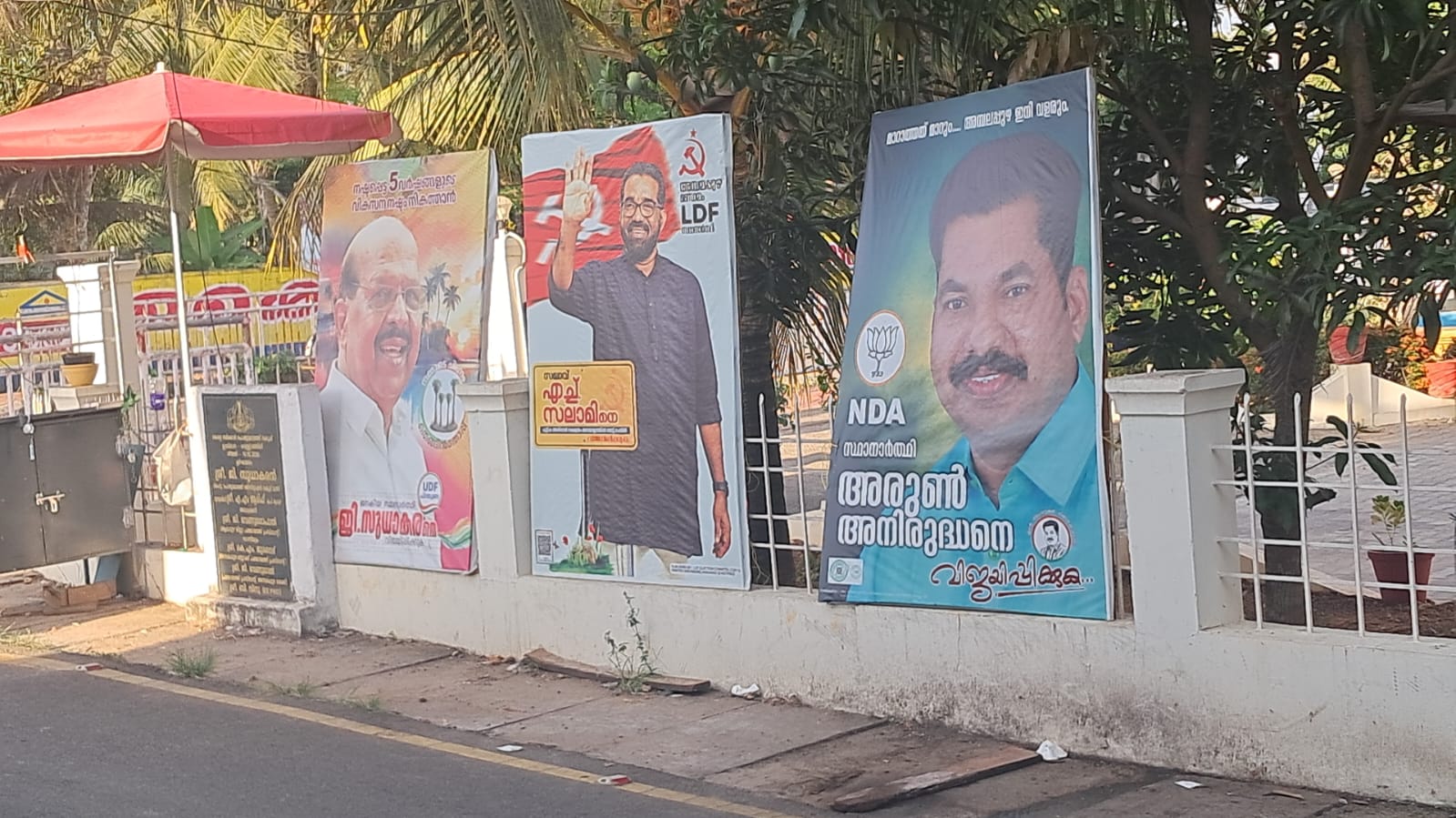 A race that will be keenly watched: posters of the candidates in Ambalapuzha, where CPM veteran G Sudhakaran is taking on his erstwhile party colleague