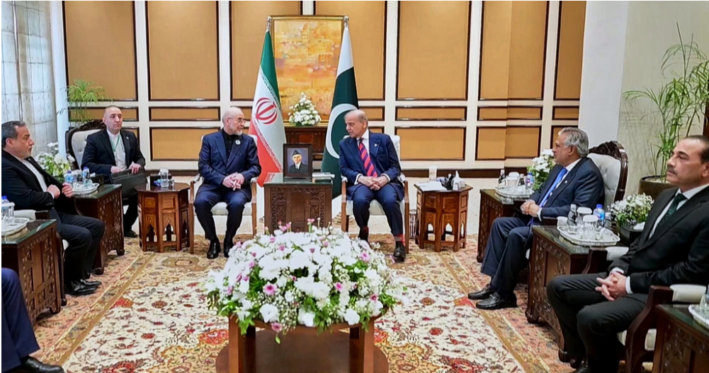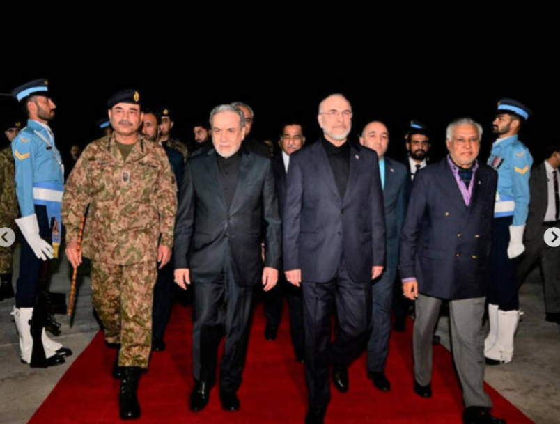 The Iranian delegation, led by Parliament Speaker Mohammad Baqer Qalibaf and Foreign Minister Abbas Araghchi in conversation with Pakistan Prime Minister Shehbaz Sharif in Islamabad. Pakistan's Army Chief Field Marshal Munir is on the right