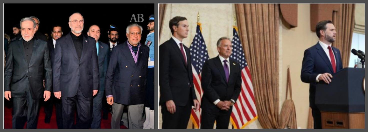 The Iranian delegation on arrival in Islamabad (left); photo source - Arabian Business, and US Vice President J D Vance addresses the media in the company of special envoy Steve Witkoff and Jared Kushner