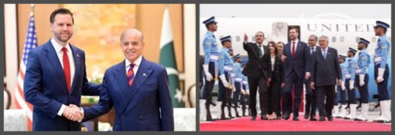 US Vice President J D Vance with PM Shehbaz Sharif (left), and being received by Field Marshal Munir at the Islamabad airport (right)