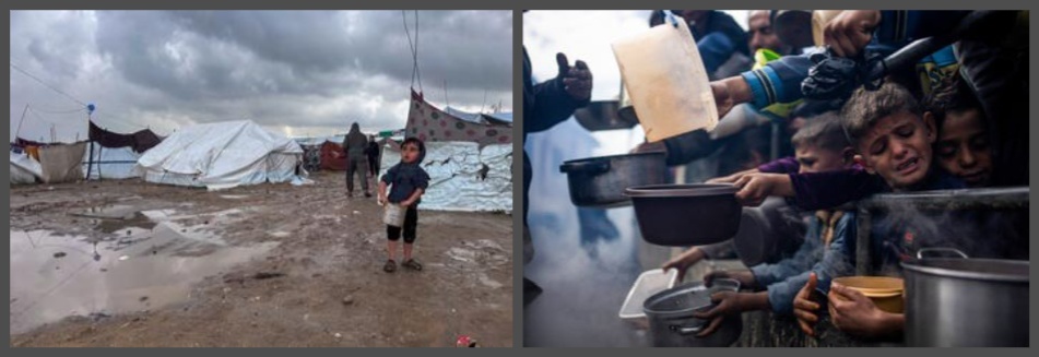 Image: A boy at the relief camp in Jabalya, Northern Gaza (left); and kids reach out for food in another Gaza camp (right)